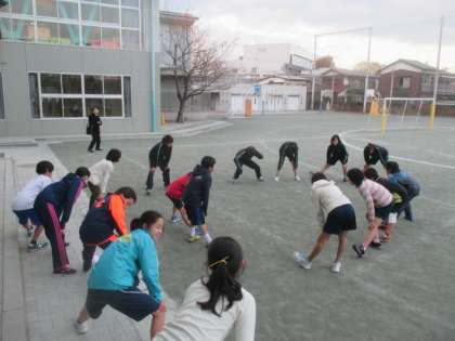 大会当日の説明を聞いた後、子どもたちは校庭に出て、本番で走る1キロメートルの距離を実際に走ってみました。まずは、みんなで準備運動です。中学生が号令をかけてくれました。その後、トラックを回ってウォーミングアップし、タイムトライアルを行いました。小学生と中学生がいっしょに走り、距離のイメージを身体で覚えます。教員のアドバイスを受けながら、みんな最後まで走りきりました。中学生に負けず、小学生もなかなかの好タイムが出て、大会への士気は一気に高まりました。