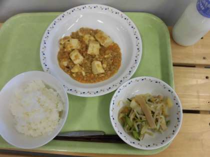 「ごはん、麻婆豆腐、白菜の中華サラダ、牛乳」です。