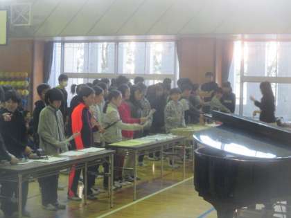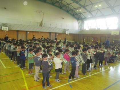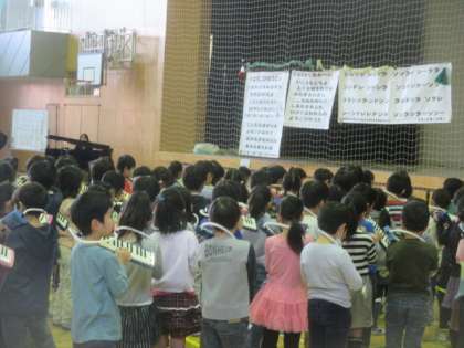 12月の音楽朝会は、全校児童による「喜びの歌」の合唱と合奏を行いました。各学年で楽器を変えて演奏しました。年末に各地で演奏される、ベートーベン作曲の『第九交響曲』が体育館に響き渡りました。