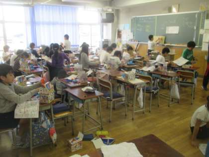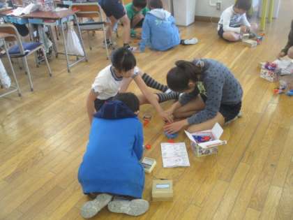 5年生の教室では、理科の電磁石の授業が行われていました。実験キットを使って、友達同士相談しながら製作し、実験していました。オープンスペースを有効に利用して、みんなで楽しく作業に取り組むことができました。