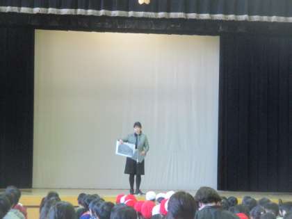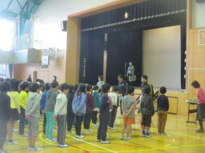 今朝の全校朝会は体育館で行われました。校長先生からは今年ノーベル賞を受賞した大隅教授についてのお話がありました。代表委員会からは、今日から終業式の日まで行う「廊下を歩こうキャンペーン」について告知がありました。2学期も残り2週間です。体調管理に気をつけて元気にがんばりましょう。