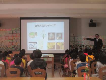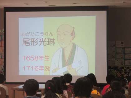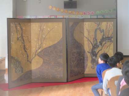 今日の2校時から6校時にかけて、3年生と5年生を対象とした美術鑑賞授業が行われました。公益財団法人岡田茂吉美術文化財団のご協力の下、美術品の画像や美術品のレプリカを使って、子どもたちに日本の美術文化の素晴らしさを味わわせ、日本文化に親しみをもってもらうための活動です。MOA美術館の講師方の説明は、子どもたちに語りかける形式でとても分かりやすく、子どもたちも興味深く話を聞くことができました。最後には尾形光琳作の紅白梅図屏風の原寸大レプリカが登場し、近くに寄って鑑賞させてもらいました。子どもたちにとってはとても貴重な講義と体験になりました。講師の先生や文化財団のスタッフの皆さんには早朝から準備していただき、素敵な授業をありがとうございました。
