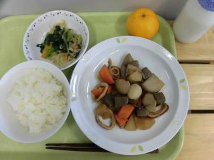 「ごはん、いかと大根の旨煮、野菜の辛子醤油かけ、ぽんかん、牛乳」です。