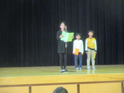 2学期の終業式が体育館で行われました。校長先生からは、2学期をしっかりふり返って、充実した冬休みを過ごしましょうというお話をいただきました。児童代表の言葉は、2年生と4年生が担当しました。この2学期の行事などを思い出しながら、がんばったこと楽しかったことなど、堂々と発表することができました。器楽クラブの演奏による校歌斉唱もしっかりできて、終業式は無事終わりました。いよいよこの後、ドキドキの通知表です。