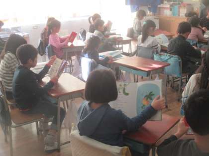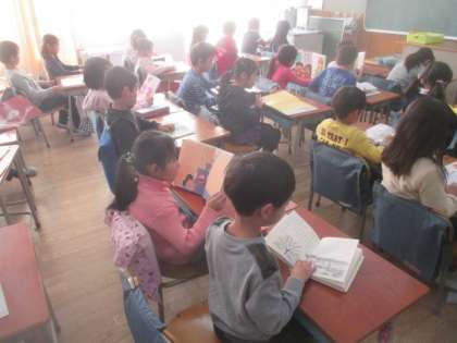 木曜日の朝は図書タイムです。低学年では、各自好きな本を静かに読んで過ごします。始業前の朝の貴重な時間。気持ちを落ち着けて本に親しむことで、1時間目から授業にも集中して取り組めます。1年生の教室でも、みんなどっぷり本の世界に浸っていました。