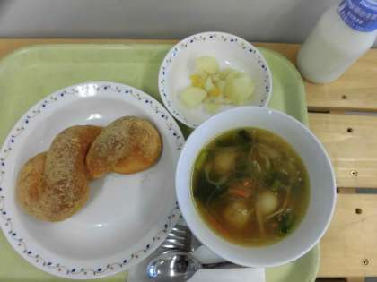 「きな粉揚げパン、肉団子入り春雨スープ、コーンポテト、牛乳」です。