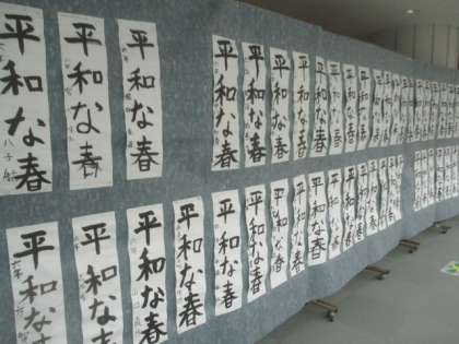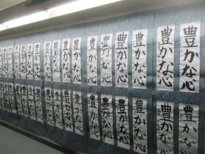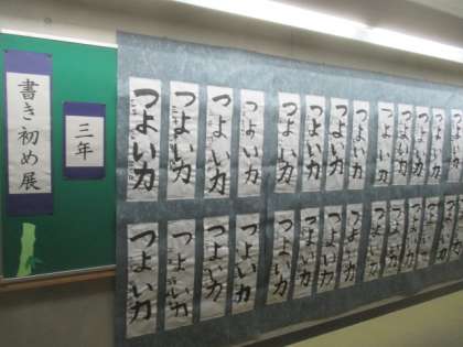 来週の月曜日から始まる書き初め展の準備が行われ、1階昇降口前には3年生、2階のフロアには4〜6年生の毛筆作品が展示されました。どの学年も見応えのある書き初めに仕上がっています。
