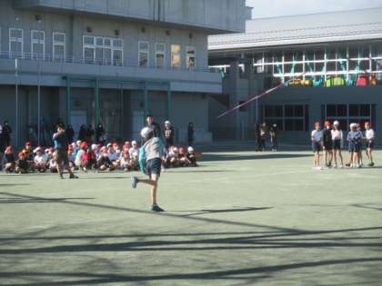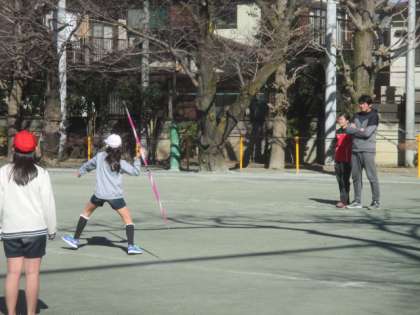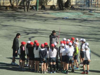 いよいよやり投げを体験します。やりの持ち方や構え方など、ていねいに指導を受けて、一人ずつ投げます。励ましの言葉やお褒めの言葉もいただき、6年生全員、笑顔で活動することができました。