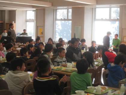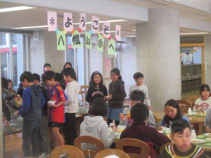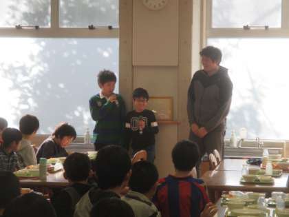 授業の後、村上先生は休む間もなく5年生との会食です。ランチルームでは、5年生の子どもたちがお出迎えをし、村上先生を囲んで楽しい給食が始まりました。今日の給食は、子どもたちの1番人気のジャンボ餃子と、村上先生の故郷愛媛県で採れた「いよかん」でおもてなしです。今日もしっかりおかわりもし、たくさん食べた5年生。村上先生も、本校の給食はとてもおいしいと言ってくださいました。