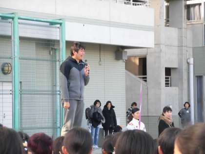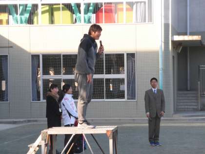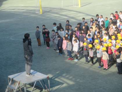 楽しい時間はあっという間です。昼休み、全校児童が集まって村上先生に今日のお礼を伝えました。村上先生からも最後にお言葉をいただき、全員でお見送りをしました。