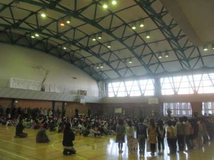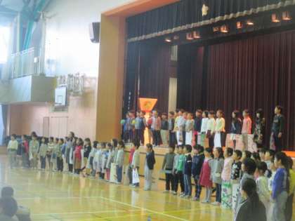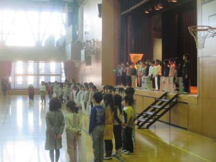 最後に1年生がそれぞれのクラスで作った歌を全員で歌いました。2曲ともとてもすてきな曲で、1年生の元気な歌声が体育館に響き渡りました。