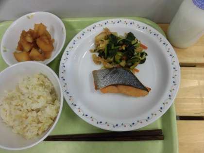 「雑穀ごはん、鮭の塩焼き、青菜と揚げの煮びたし、じゃが芋の甘辛煮、牛乳」です。