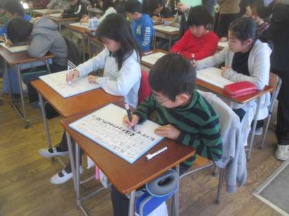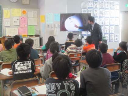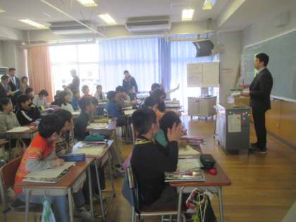 5校時、今年度の最後となる校内研究授業が、5年2組の教室で行われました。理科の「もののとけ方」の単元で、導入から第2次に当たる授業が行われました。前時に続き、食塩が水に溶ける様子を、拡大投影機を使って行い、子どもたちの興味・関心を深めます。目の当たりにした現象に対し、「食塩は本当になくなってしまったのか。」について、子どもたちは、自分の考えを整理していきます。授業者の畑中教諭は、子どもたちのつぶやきを大事にしながら、友達同士でそれぞれの考えを照らし合わす場を設定し、自分の考えが深まるような授業を組み立てました。