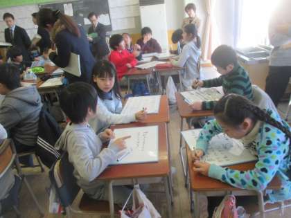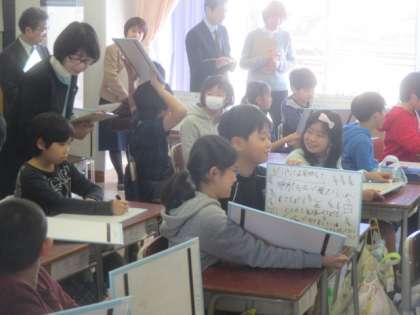 子どもたちは、自分の考えをホワイトボードに書いて整理します。1人に1枚のホワイトボードが配られ、子どもたちは思ったことをどんどん書いて、友達同士で考えを伝え合っていました。