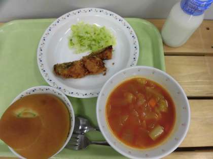 「明日葉パン、白身魚のフライ、コールスロー、ミネストローネ、牛乳」です。