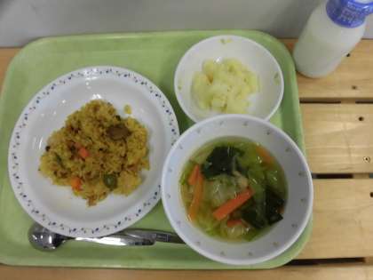 「カレーピラフ、チーズ入り粉ふき芋、野菜スープ、牛乳」です。
