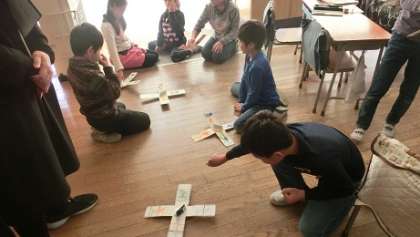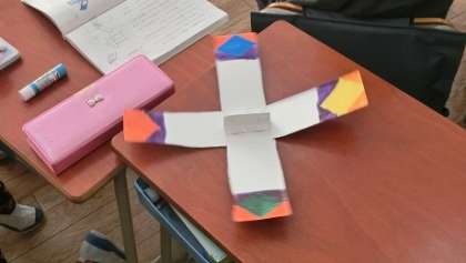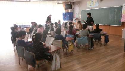 2年3組の2時間目は、国語の「紙パックで こまを作ろう」の学習でした。今日は、こまの軸を取り付ける方法を教科書で確認し、実際に作業をしました。繰り返し音読することで、作業のポイントを押さえます。実際にこまを回しながら、軸の位置を何度も調整し、真剣に課題に取り組んでいる姿が印象的でした。