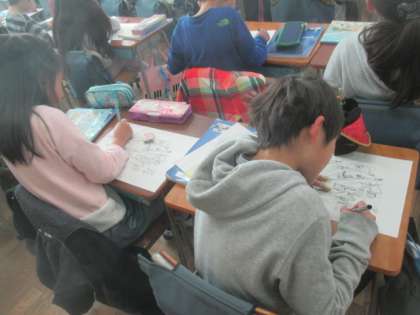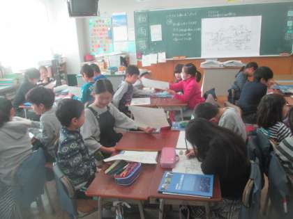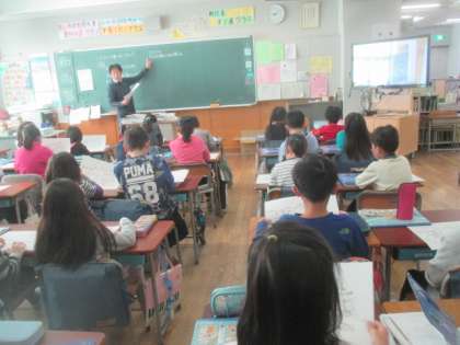 3年1組の1時間目は、社会科の学習で「安全なくらしを守る」の単元の授業でした。資料を見て、消火活動にかかわる人々の仕事を見つけ、何をしているかを考えてワークシートに書き込みます。書き留めたことをグループで話し合い、最後に全体で気がついたことを発表する活動でした。大きな火事から町を守るために、いろいろな人たちが協力し合っていることを理解しました。聞く人に分かるように、自分の考えを整理して、きちんと発言することができる3年生の子どもたちでした。
