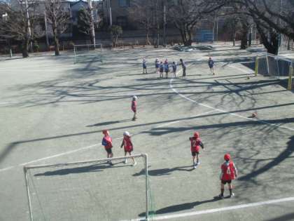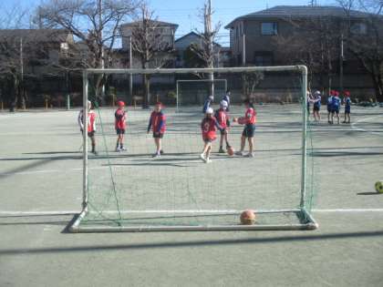1時間目の4年2組では、校庭での体育の授業。サッカーのゲームに取り組んでいました。チームで作戦を話し合ってからゲームに臨みます。それぞれのチームでメンバーの役割を決め、いざキックオフ。元気なかけ声とともに、朝から白熱した試合が行われていました。