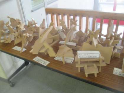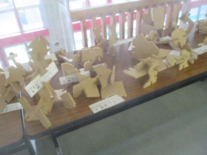 2階のフロアに、6年生の作った木工作品が展示してありました。それぞれの個性が生かされた、楽しい作品の数々に、ふと足をとめて見てしまいました。