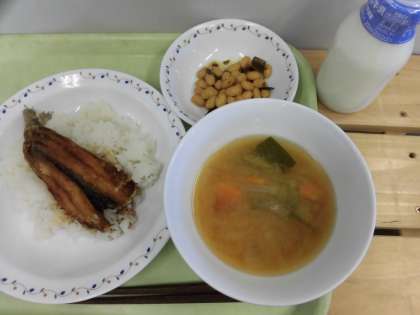 「鰯の蒲焼丼、昆布豆、味噌汁、牛乳」です。
