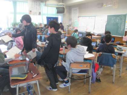 2月の委員会活動が6校時にありました。広報委員会は、パソコンを使って記事の内容を調べながらの新聞作りです。立派な新聞が仕上がるのを楽しみにしたいです。飼育委員会は、ウサギの世話をしました。毎日の生き物の世話は大変です。冷たい風が吹く中、ご苦労様でした。