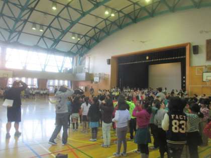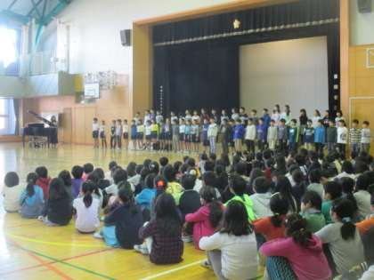 今朝の音楽朝会は寒い体育館で、まずは全校で声を出し、ちょっと体を動かしての「ドレミのうた」でスタートしました。その後、先日の『2分の1成人式』で歌った「いのちのうた」を、4年生が披露してくれました。澄んだ歌声が体育館に響き渡り、素敵な歌詞がジーンと染み渡りました。全校児童がみんな4年生の歌に聴き入っていました。