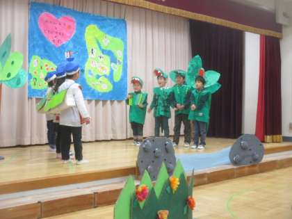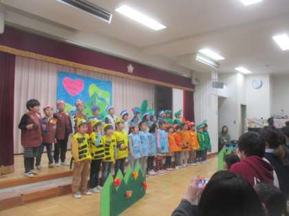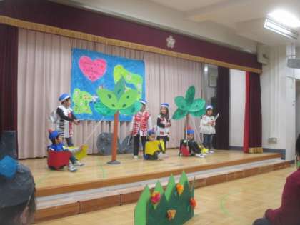 今日は八幡山幼稚園のきく組、すみれ組のこども会がありました。『ブレーメンの音楽隊』や『エルマーの冒険』のすてきな劇を披露してくれました。お友だちと一緒にのびのびと表現している姿は、とても微笑ましく思いました。たくさんのご家族の方々が参観し、大きな拍手をもらっていました。子どもたち一人一人の成長が感じられる、素敵な発表会でした。