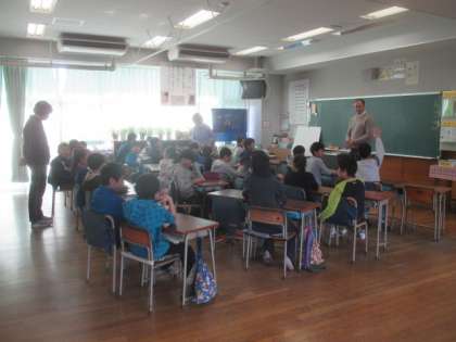 今週はいつものエリック先生に代わって、クリス先生による外国語の授業は中学年で行われました。背の高いやさしそうなクリス先生に、初対面の子どもたちは気さくに話しかけることができ、楽しい1時間になっていました。授業を通して、子どもたちはどんどん英語に親しめているようです。