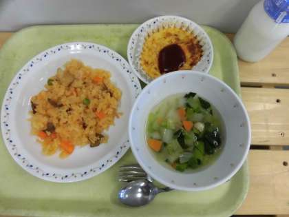 「チキンライス、チーズ入り卵焼き、白菜のスープ、牛乳」です。