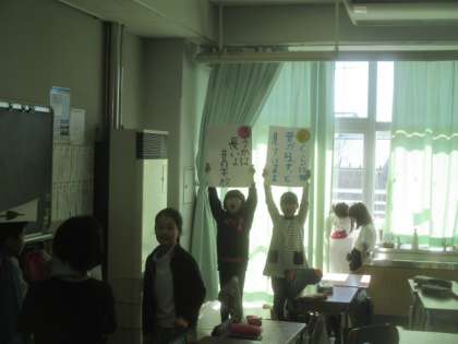 3年生は総合的な学習の時間に、八幡山今昔物語のまとめの学習を学年で行っていました。ゲストティーチャーからうかがったお話をもとに、新聞やカルタなどにしてまとめ、紹介していました。1・2組混じり、グループで協力して取り組んでいました。