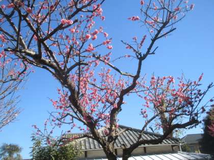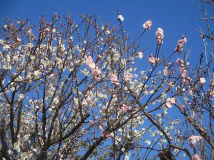 南門の梅の木がきれいに色づいていました。白や薄紅色など色とりどりの花が、太陽の光で輝いて見えます。「梅一輪一輪ほどの暖かさ」という俳句にもあるように、寒さの中にも、一歩一歩着実に春は近づいてきているようです。