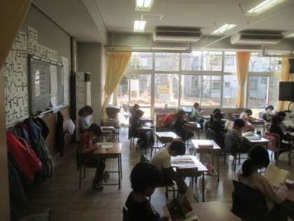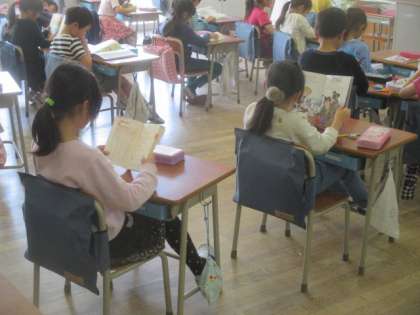 5時間授業の1年生、午後はテストと読書の時間です。課題が終わった子から、図書館の一括貸し出しで借りた本から選んで読書をします。どの本にしようか迷っていましたが、みんな本が大好きです。