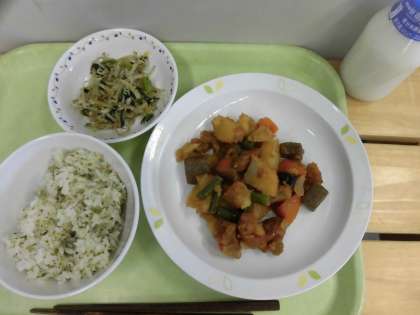 「じゃこと青のりのごはん、鶏肉の揚げ煮、ほうれん草の乾物和え、牛乳」です。