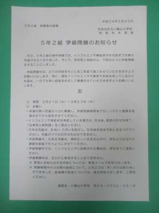 日頃より、本校の教育活動にご理解、ご協力をいただきありがとうございます。本日、5年2組では、インフルエンザ(風邪を含む)による欠席が多数みられました。これ以上の感染を防ぐため、学校医とも相談した結果、2月21日(火)から23日(木)までの3日間、学級閉鎖を行うことにいたしました。学級閉鎖中は、健康管理、家庭での過ごし方にご配慮をお願いいたします。一日も早い回復をめざして療養してください。