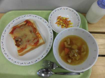 「ピザトースト、白いんげん豆の田舎風スープ、人参サラダ、牛乳」です。