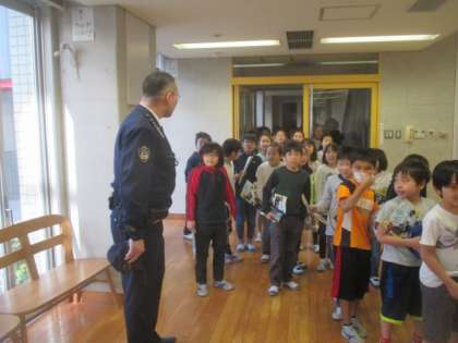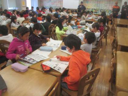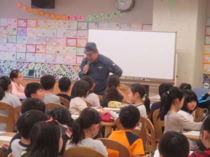3年生は、社会科の「火事をふせぐ」の単元の学習で、八幡山町会防災部長の尾崎直人さんと世田谷警察署の方々にご来校いただき、地域防災を中心に災害時の身の守り方等について話していただきました。授業には、いつもお世話になっている八幡山駐在所の武藤巡査長さんにも参観していただき、子どもたちに声をかけていただきました。最初にランチルームでの講義でしたが、子どもたちは真剣にメモを取りながら話を聞いていて、武藤さんからもお褒めの言葉をいただきました。