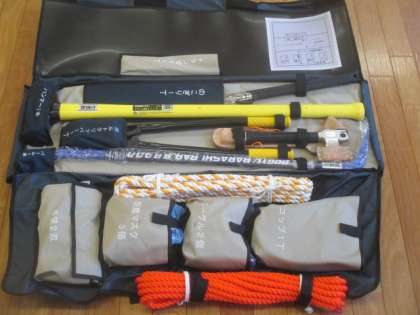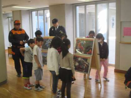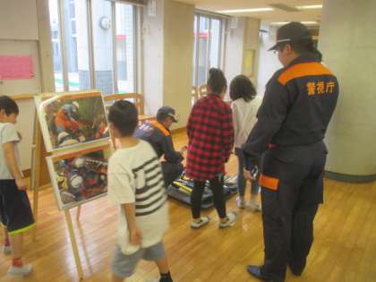 成城警察署の方々からは、熊本大地震の時の様子を紹介するパネルや、災害時に使用する救助用の工具などを持参していただき、子どもたちに紹介してくれました。