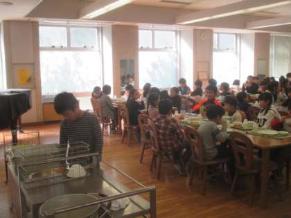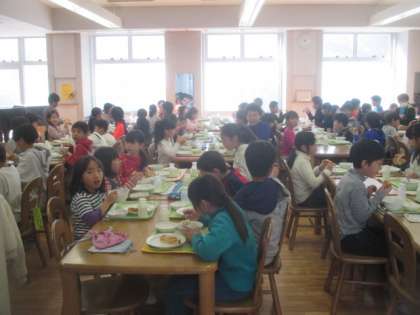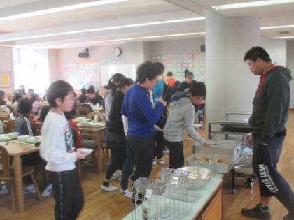 今日は、3年生が6年生とのお別れ交流給食でした。6年3組のお兄さんたちの食欲に、3年生もびっくり。でも、3年生も負けずにもりもり食べて、楽しく談笑しながらの会食でした。