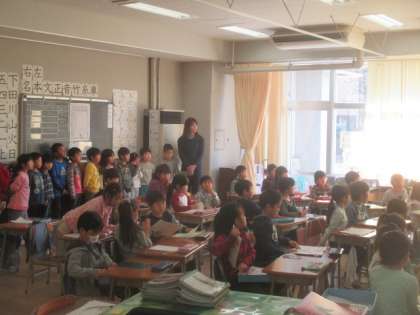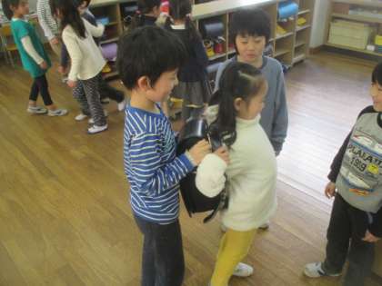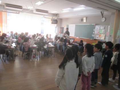 昨日の八幡山幼稚園との交流に続き、今日は松沢保育園の年長組の子どもたちが来校し、1年生と交流しました。ちょっと緊張気味の園児たちに、1年生は堂々と授業を受ける様子を見せ、今日もお兄さん・お姉さんぶりを発揮していました。