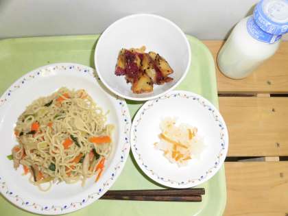 「塩焼きそば、大学の甘酢かけ、りんご入り大学芋、牛乳」です。