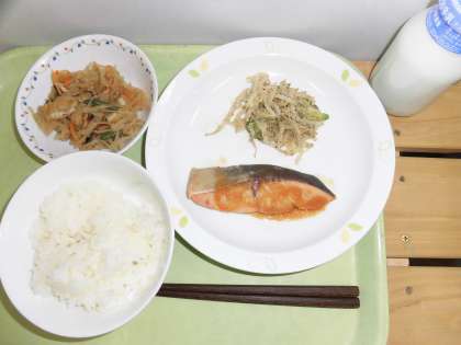 「ごはん、鮭のステーキソース、ごま酢かけ、切干大根の煮付け、牛乳」です。