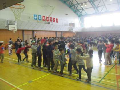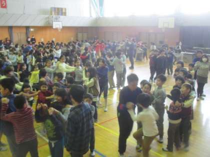 6年生への思いが伝わった各学年の出し物の後は、全校ランキングの発表とゲームの時間です。ゲームは、全校で楽しめる「ジャンケン列車」を行いました。いつもは同じ学年でまとまりがちなゲームですが、どの学年も積極的に6年生に近づき、列を組んでいました。6年生を中心にした楽しい活動になりました。