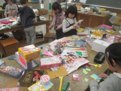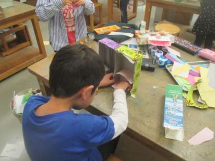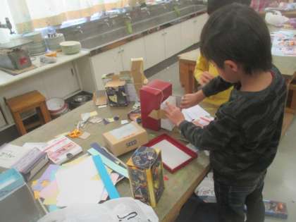 1組は、『ゆめのまち さんちょうめ』の単元の学習で、いろいろな箱を使った建物を作りました。エレベーターのあるビルや、大きな自分の部屋のあるお家など、夢中になって作っている真剣な姿に、1年生の成長ぶりがうかがえました。みんなの作品を並べて、素敵な町ができるといいですね。
