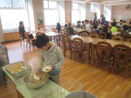 今週は2年生が、6年生との交流給食を行いました。今週は6年生を送る会も終わり、3年生は、いよいよ6年生のお兄さんお姉さんと過ごす時間も残りわずかとなります。たわいのない会話の中にも、小学校でしか味わえない雰囲気をかみしめながら、6年生は3年生に声をかけていました。来週でいよいよ交流給食も最終週となり、1年生との交流が予定されています。