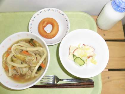 「カレーうどん、りんごと白菜のサラダ、米粉のポテトドーナツ、牛乳」です。