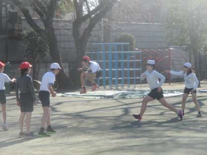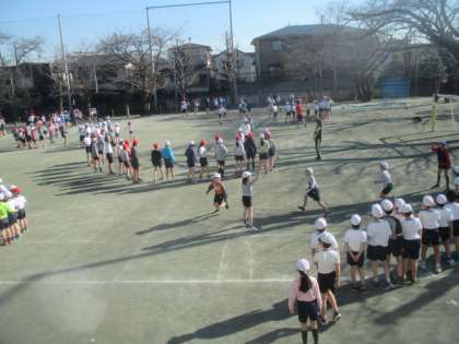 今年度最後となる体育朝会は、1年間クラスで取り組んでいた長なわ跳びです。3分間で何回跳べるかの記録に挑戦します。1年生も体育委員会のお兄さんやお姉さんたちに手伝ってもらって、とても上手になりました。6年生は、さすがスピードや迫力が違って見えました。