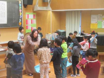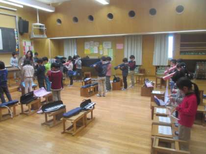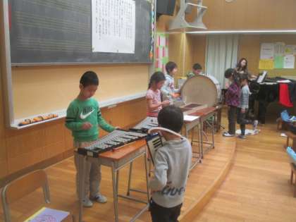 1年2組の音楽の時間は、合奏の練習です。いろいろな楽器をみんなで分担して、「キラキラ星」を演奏していました。リズムを感じながら、みんなで合わせようとする一生懸命な姿に感動しました。