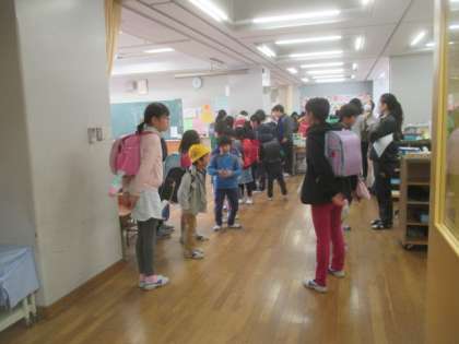 各教室での活動が終わり、いよいよ下校開始です。まずは、学童クラブに行く児童が移動します。最後の仕事として、6年生が1年生を送り出してくれました。1年生もあわてずに、順番に名前を伝えてから集合場所に並びます。