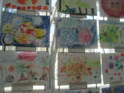 2年生の教室には、図工の「形のかくれんぼ」の作品が展示されています。いろいろ形が隠された作品は、見ているだけでも楽しくなります。選んだ形をどう生かして作品にしようかと、いろいろ試行錯誤しながら描いた努力のあとがうかがえる作品になっていました。